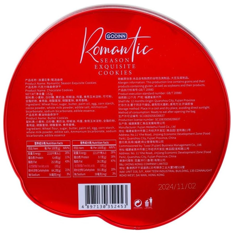 کوکی لوکس رمانتیک گادین GODINN Romantic Season Exquisite Cookies ترکیبی از طعم بینظیر و بستهبندی شیک هستند. این محصول در یک جعبه زیبا با طرح گل رز قرمز عرضه میشود که جلوهای عاشقانه و خاص دارد. کوکی ها با بهترین مواد اولیه تهیه شدهاند تا تجربهای خوشمزه و بهیادماندنی برای شما و عزیزانتان رقم بزنند.